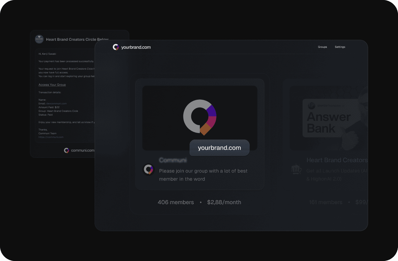 Your community 100% on your own domain — no Communi URLs.